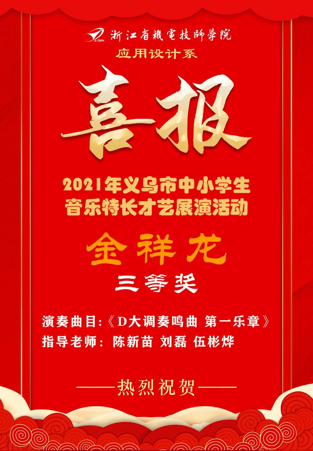 祝賀我系金(jīn)祥龍同學在義烏市(shì)中小(xiǎo)學生(shēng)音(yīn)樂(yuè)特長(cháng)才藝展演中取得(de)佳績