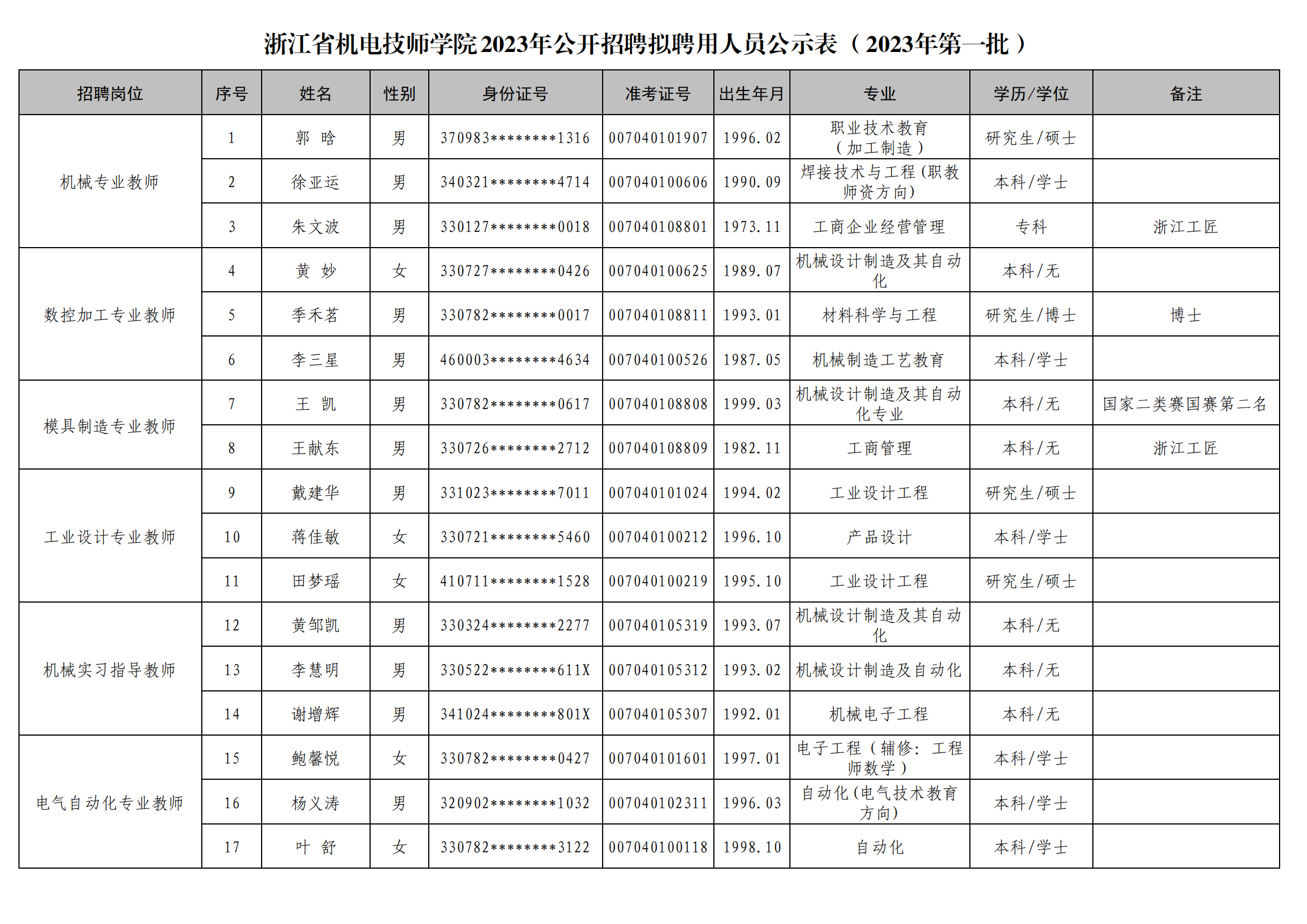 浙江省機電技師學院2023年(nián)公開(kāi)招聘拟聘用(yòng)人(rén)員(yuán)公示表(第一(yī)批)