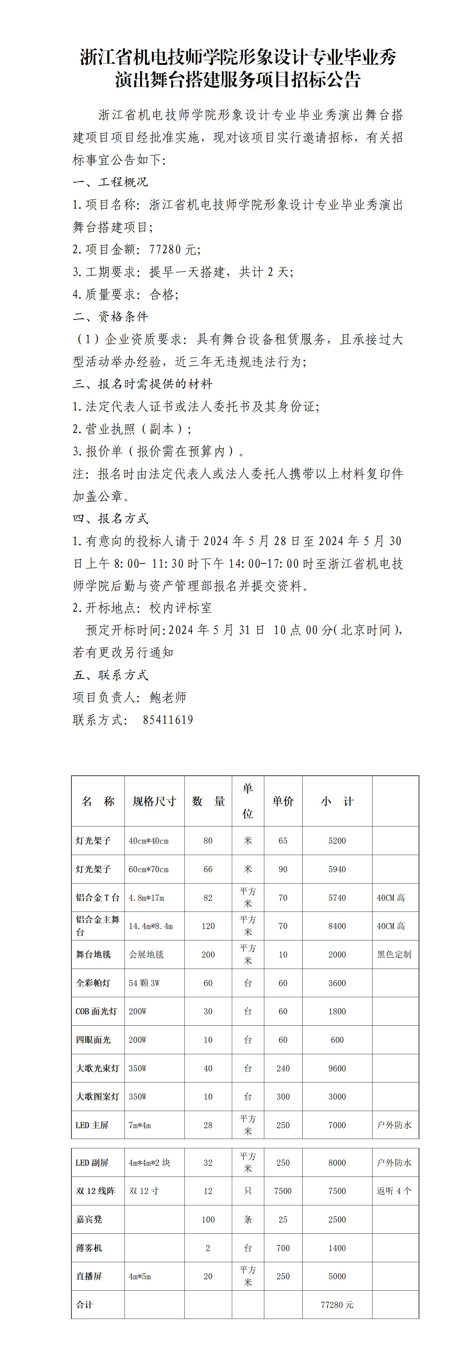 浙江省機電技師學院形象設計(jì)專業(yè)畢業(yè)秀演出舞(wǔ)台搭建服務項目招标公告