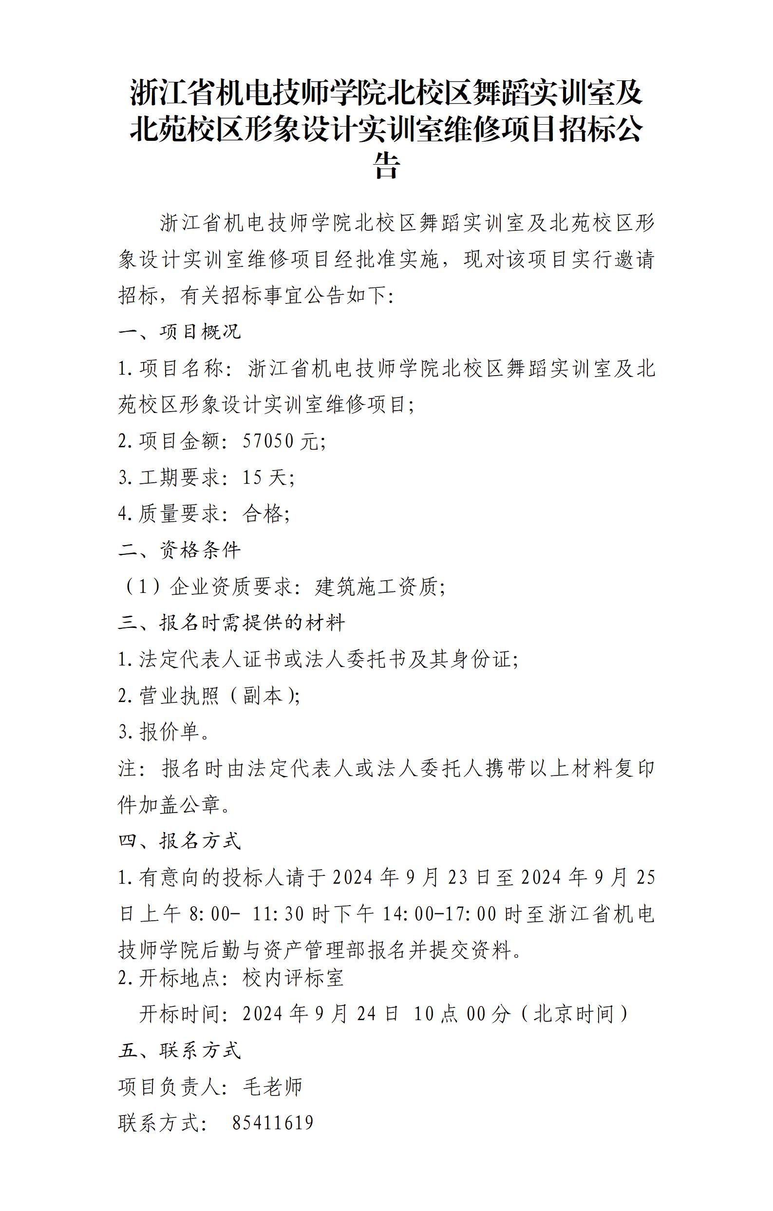 浙江省機電技師學院北(běi)校(xiào)區(qū)舞(wǔ)蹈實訓室及北(běi)苑校(xiào)區(qū)形象設計(jì)實訓室維修項目招标公告€