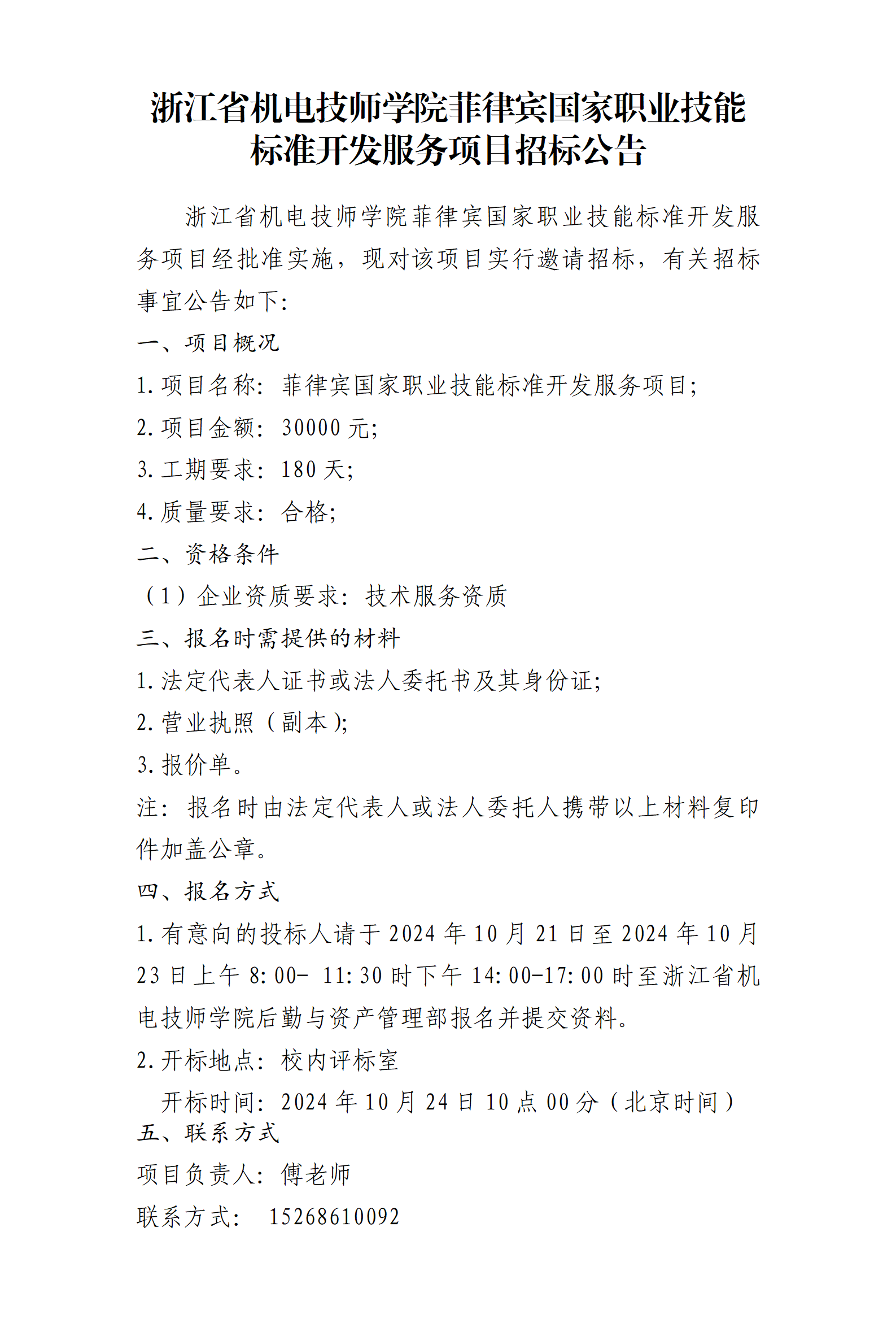 浙江省機電技師學院菲律賓國(guó)家(jiā)職業(yè)技(jì)能(néng)标準開(kāi)發服務項目招标公告