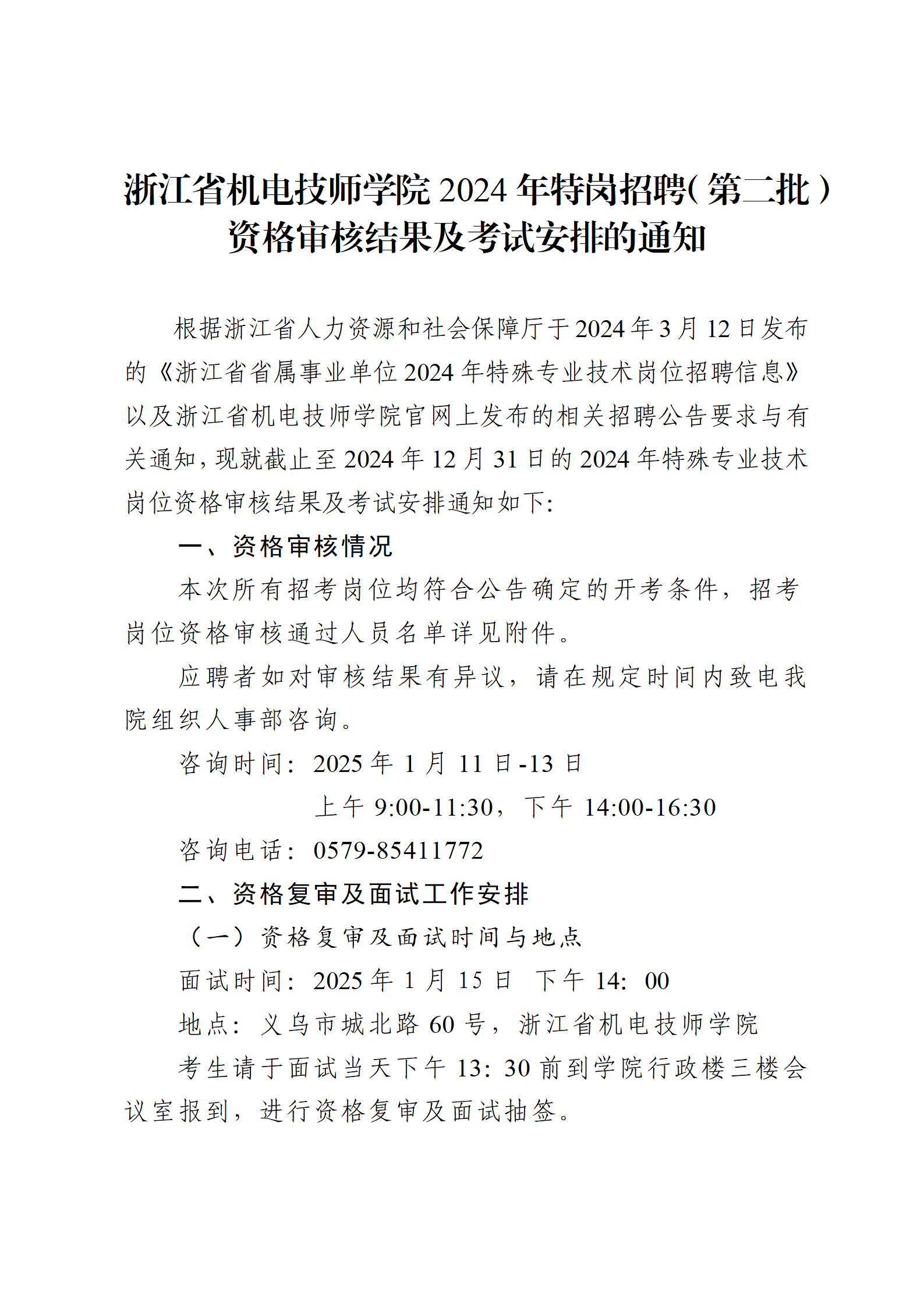 浙江省機電技師學院2024年(nián)特崗招聘(第二批)資格審核結果及考試安排的(de)通(tōng)知(zhīα)