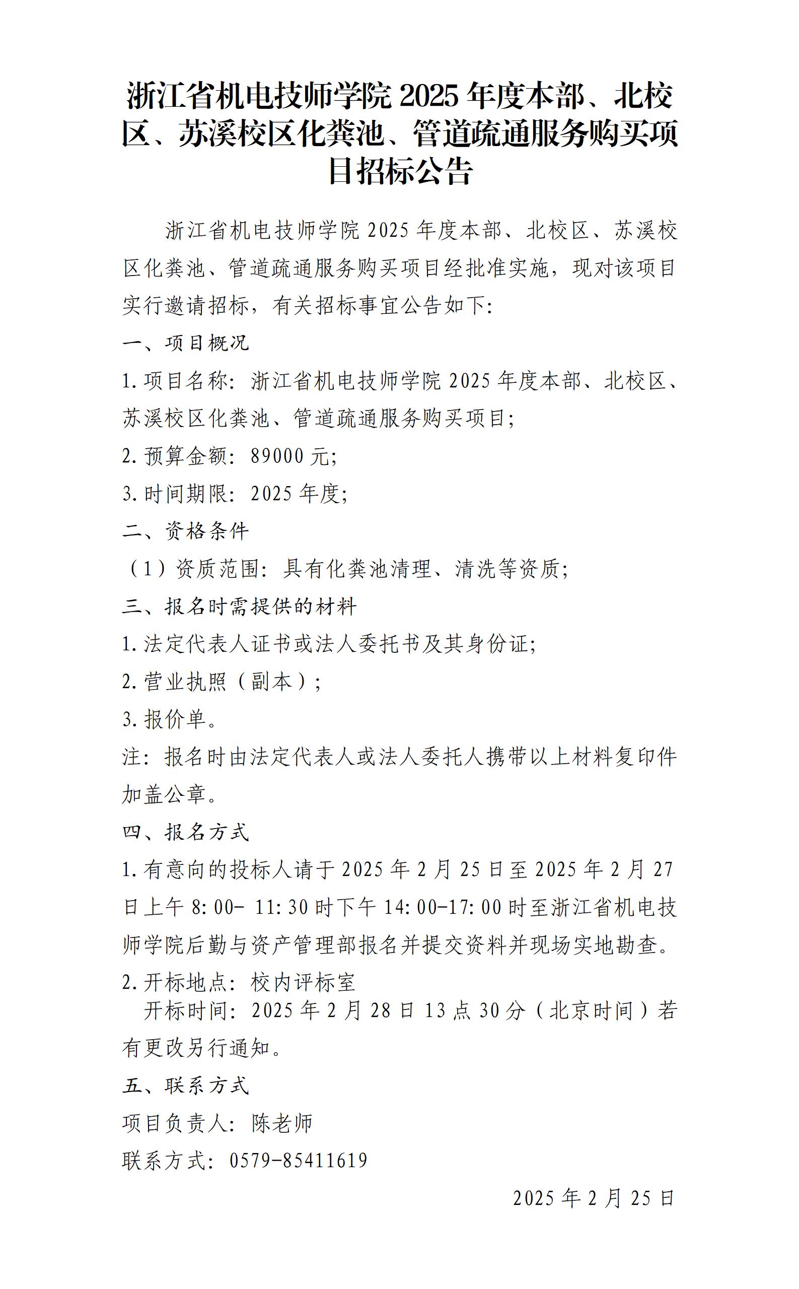 浙江省機電技師學院2025年(nián)度本部、北(běi)校(xiào)區(qū)、蘇溪校(xiào)區(qū)化(huà)糞池、管道(dào)疏通(tōn∑g)服務購(gòu)買項目招标公告
