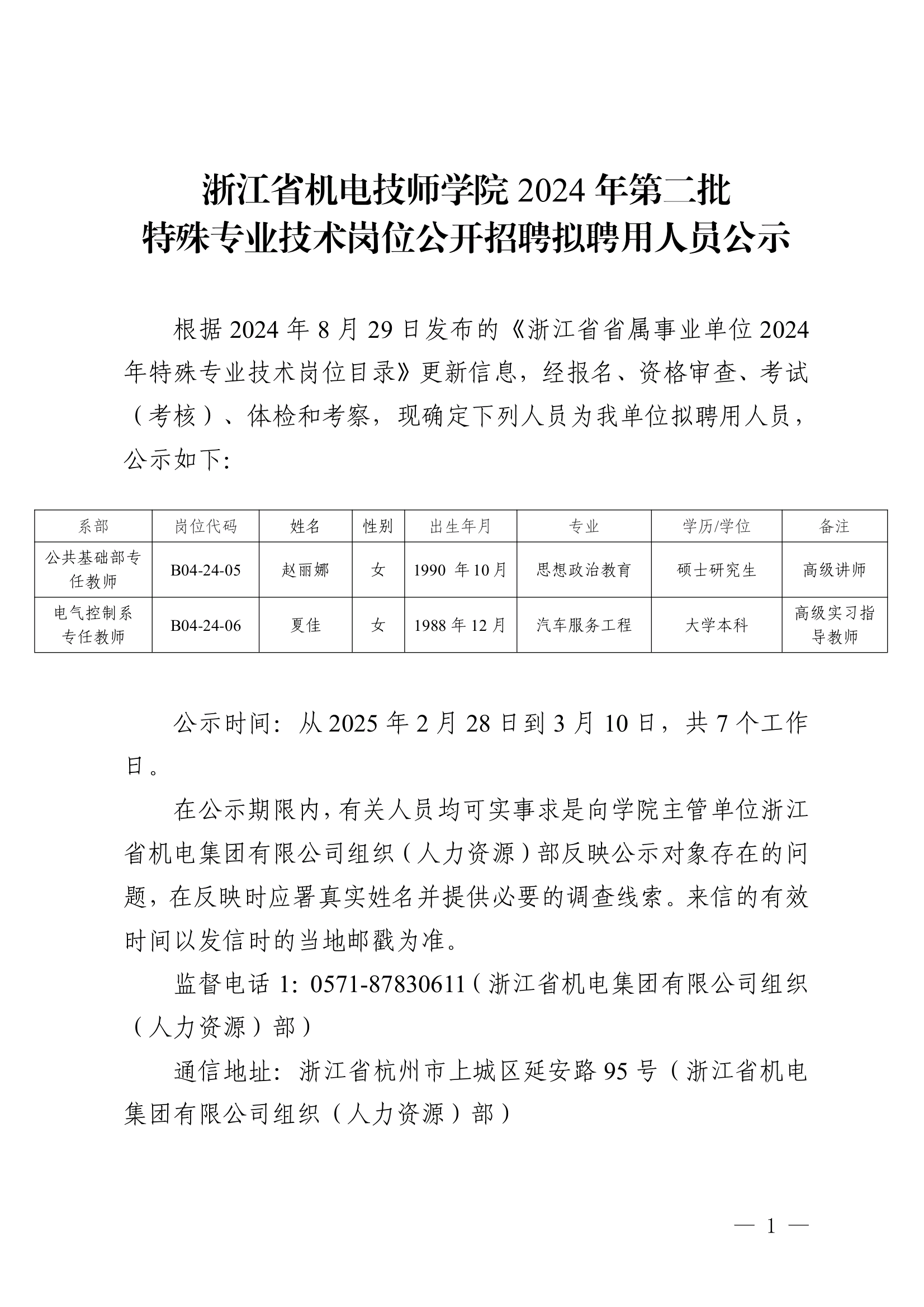浙江省機電技師學院2024年(nián)第二批特殊專業(yè)技(jì)術(shù)崗位公開(kāi)招聘拟聘用(yòng)人(rén)員↓(yuán)公示
