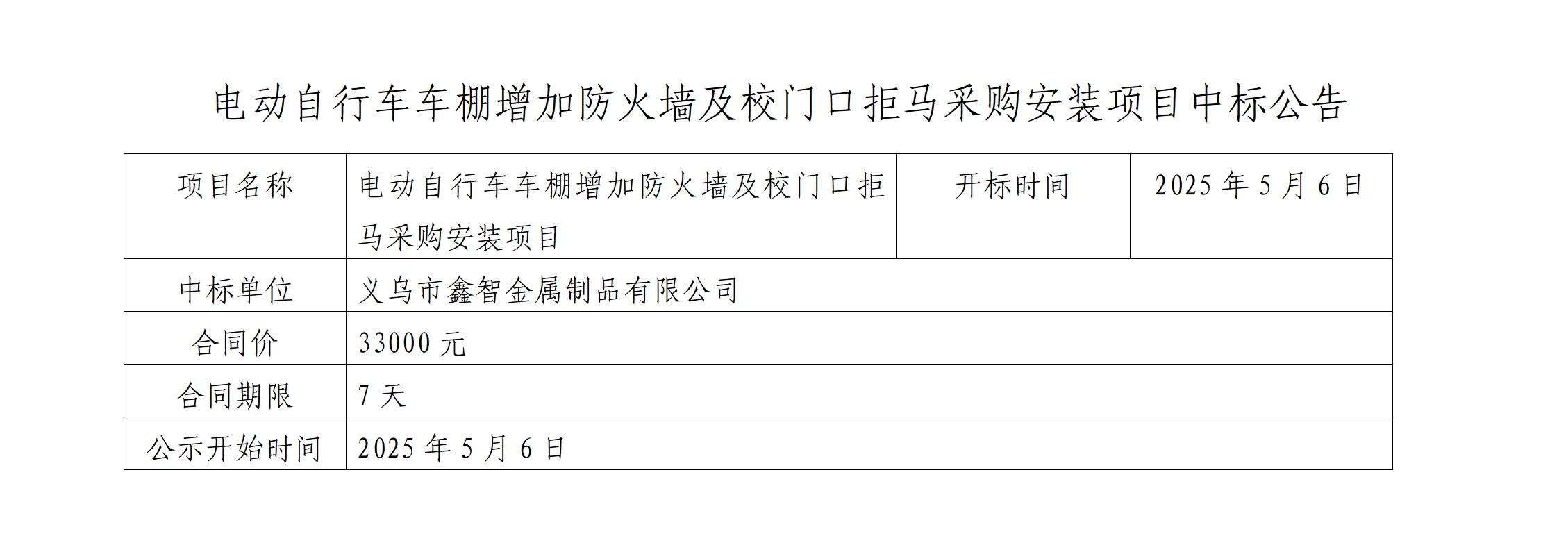 電(diàn)動自(zì)行(xíng)車(chē)車(chē)棚增加防火(huǒ)牆及校(xiào)門(mén)口拒馬采購(gòu)安裝項目中标公告