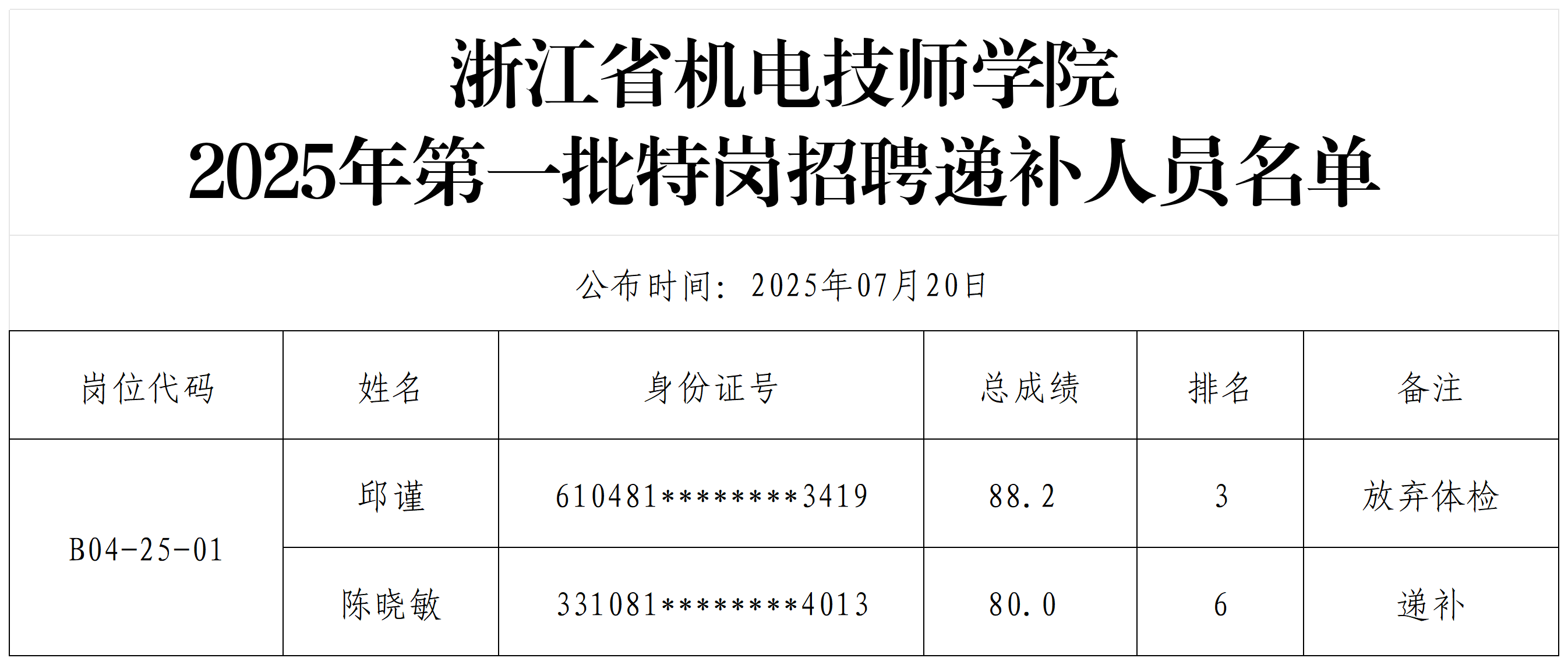 浙江省機電技師學院2025年(nián)第一(yī)批特崗招聘遞補人(rén)員(yuán)名單