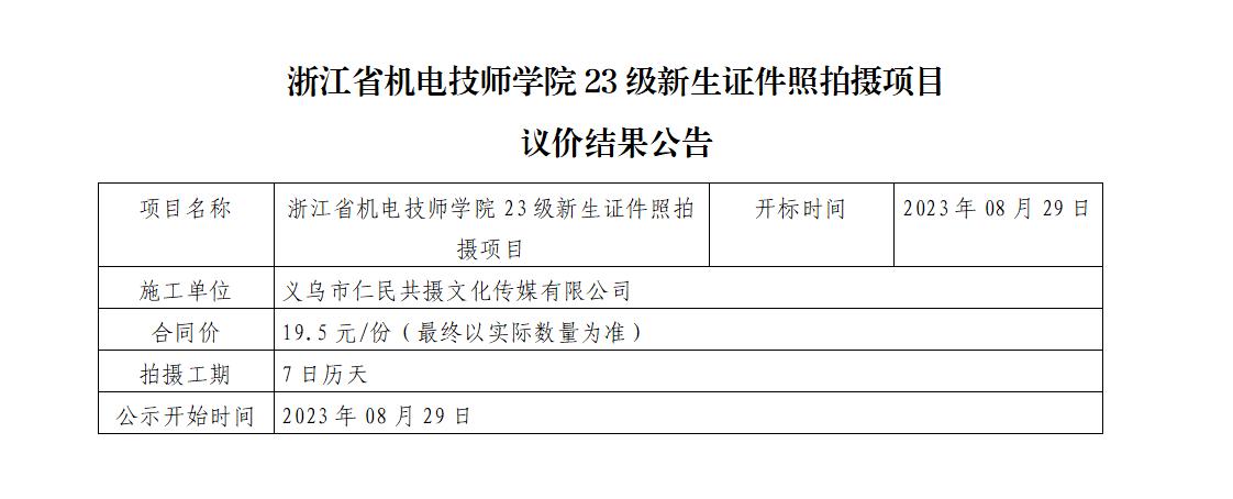 浙江省機電技師學院23級新生(shēng)證件(jiàn)照(zhào)拍(pāi)攝項目議(yì)價結果公告