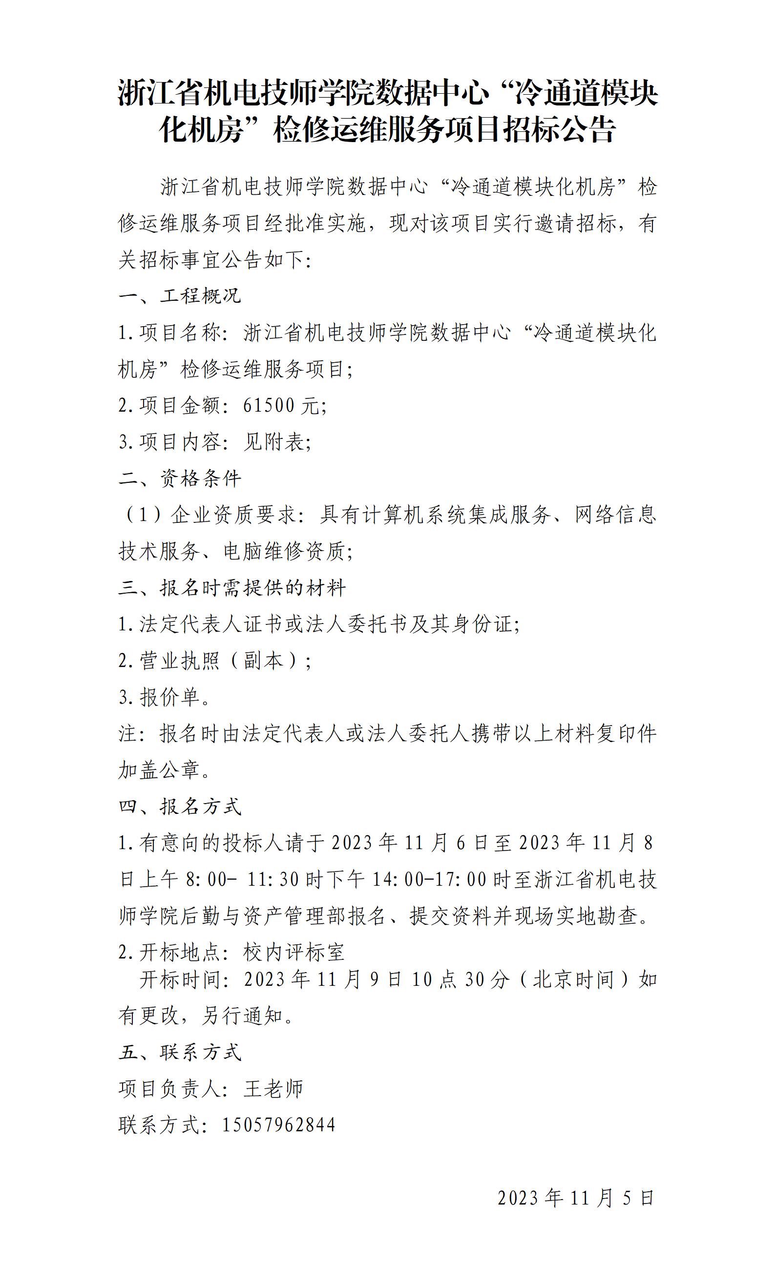 浙江省機電技師學院數(shù)據中心“冷(lěng)通(tōng)道(dào)模塊化(huà)機(jī)房(fán¥g)”檢修運維服務項目招标公告