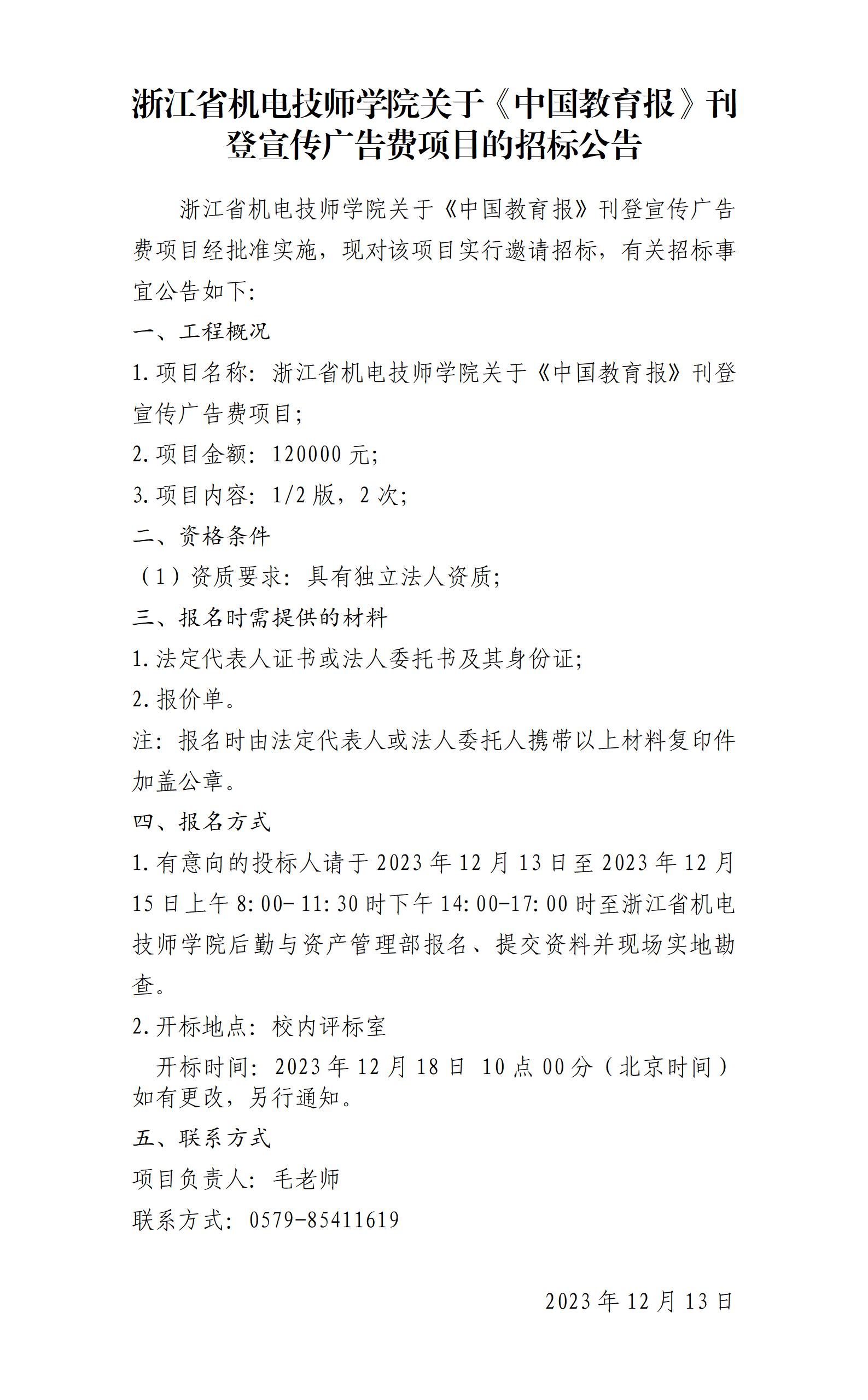浙江省機電技師學院關于《中國(guó)教育報(bào)》刊登宣傳廣告費(fèi)項目的(de)招标公告
