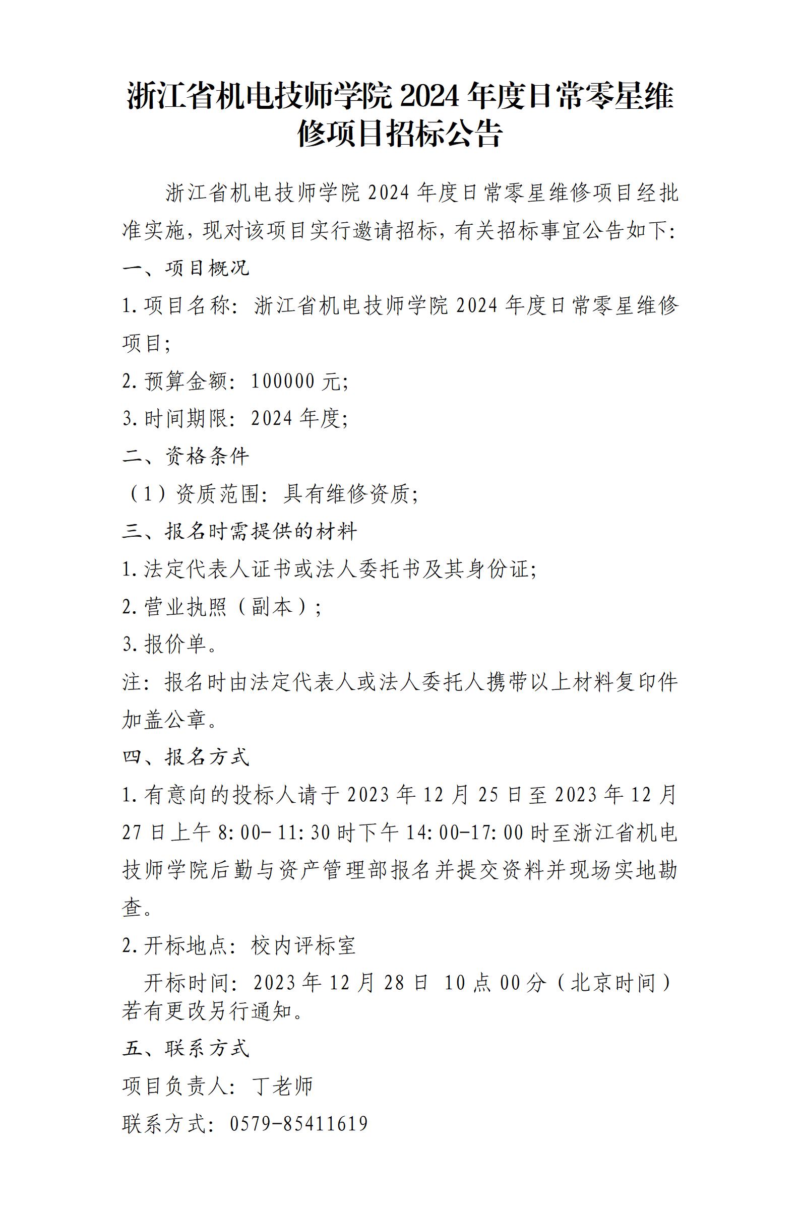 浙江省機電技師學院2024年(nián)度日(rì)常零星維修項目招标公告