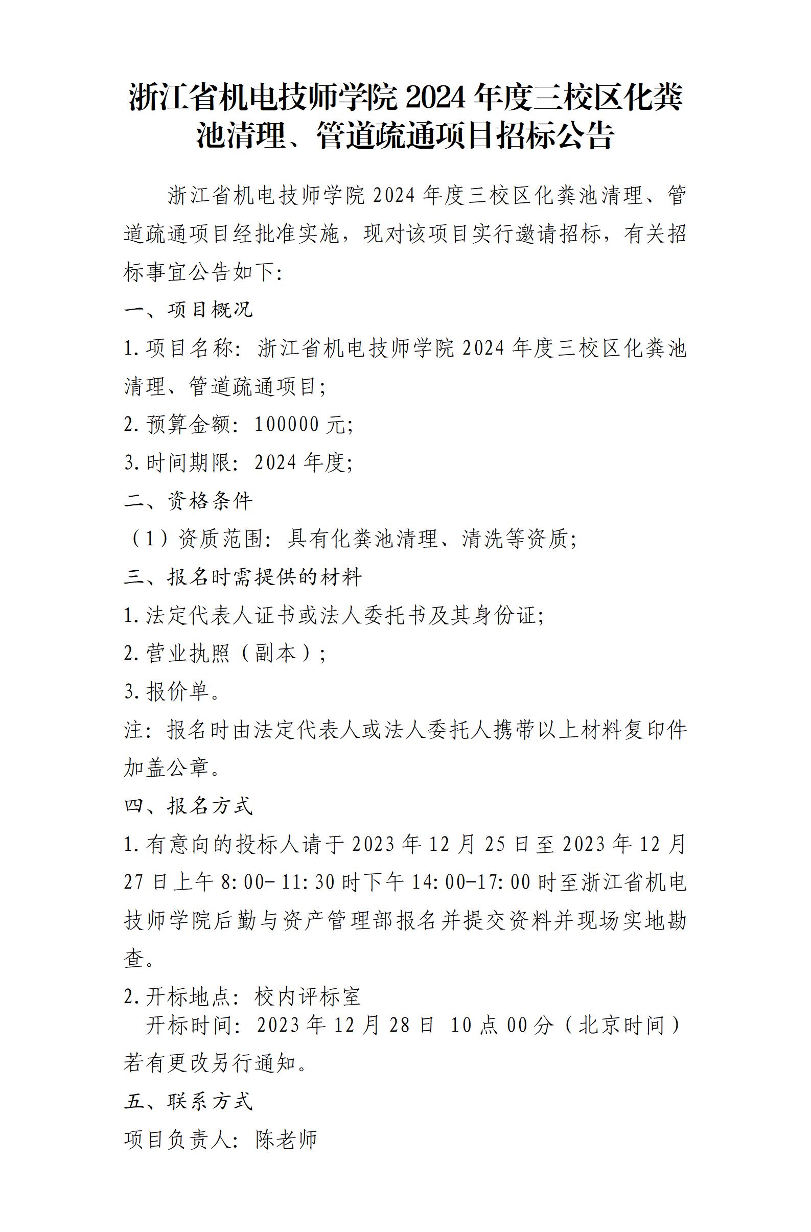 浙江省機電技師學院2024年(nián)度三校(xiào)區(qū)化(huà)糞池清理(lǐ)、管道'(dào)疏通(tōng)項目招标公告