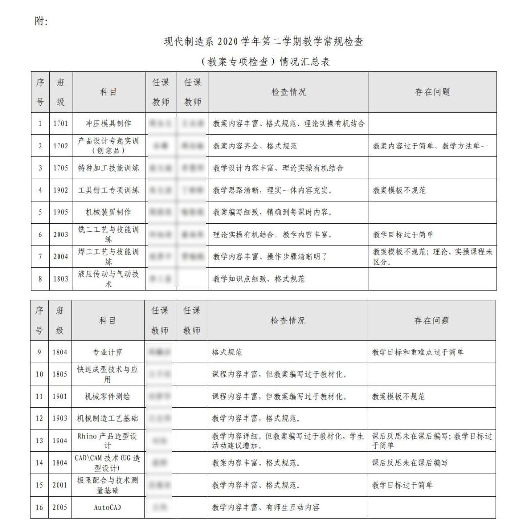 為(wèi)規範教育日(rì)常,提升教學質量,按照(zhào)《2020學年(nián)第二學期現(xiàn)代制(zhì)造系督®導工(gōng)作(zuò)計(jì)劃》要(yào)求,系督導組成立檢查小(xiǎo)組,對(duì)抽查到(dào)的(de)教師(shī)上(shàng)交 的(de)教案開(kāi)展專項督查工(gōng)作(zuò)。