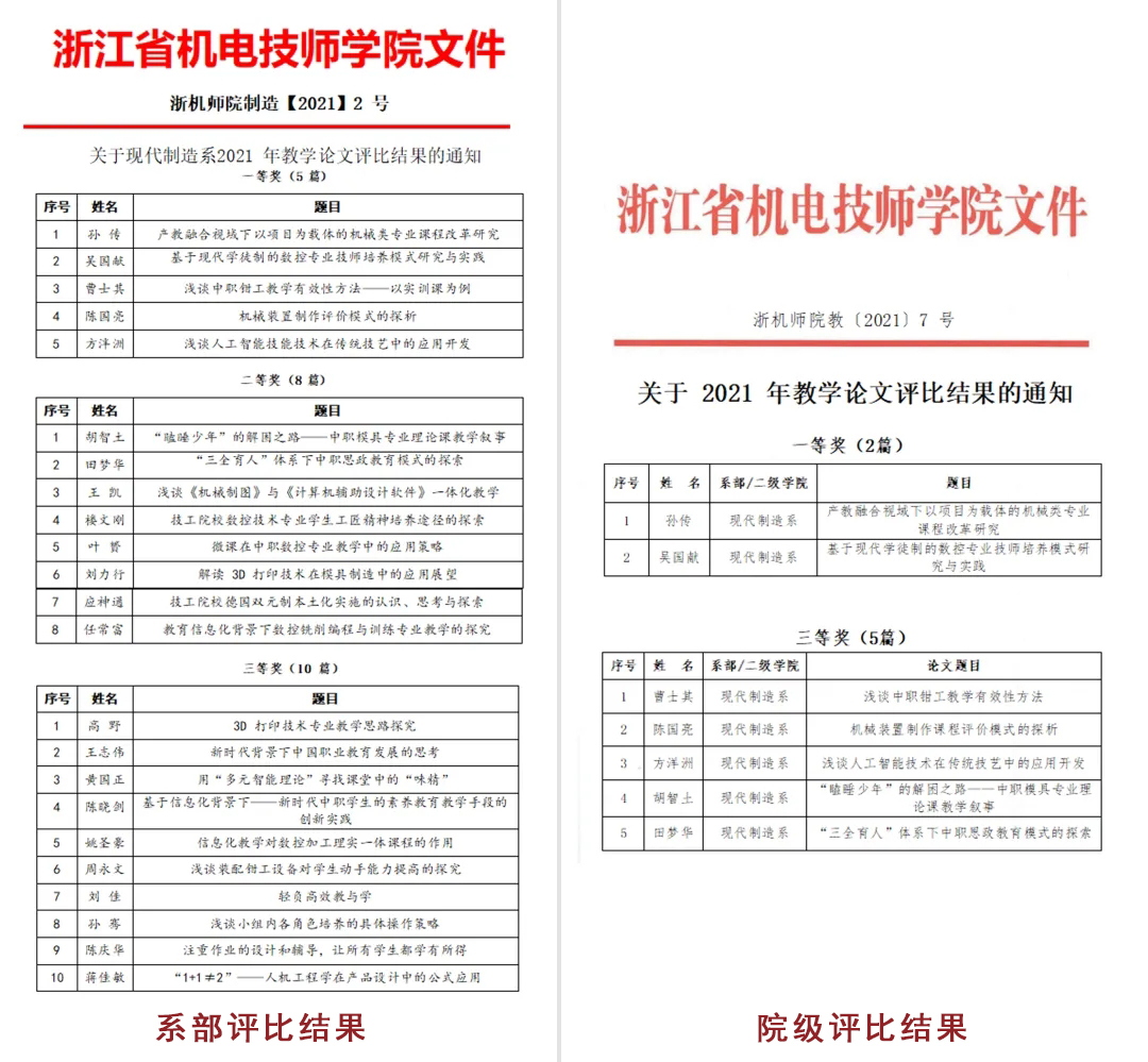 根據義烏市(shì)教育研修院下(xià)發的(de)《關于組織 2021 年(nián)義烏市(shì)中小(xiǎo)學、幼兒(ér)園教學論文(wén§)評比的(de)預發通(tōng)知(zhī)》,全系共上(shàng)交論文(wén) 43 篇,經系部評選後報(bào)送教務處參加院級評比。評比結果公布如(rú)下(xi✔à)(各等級排名不(bù)分(fēn)先後):
