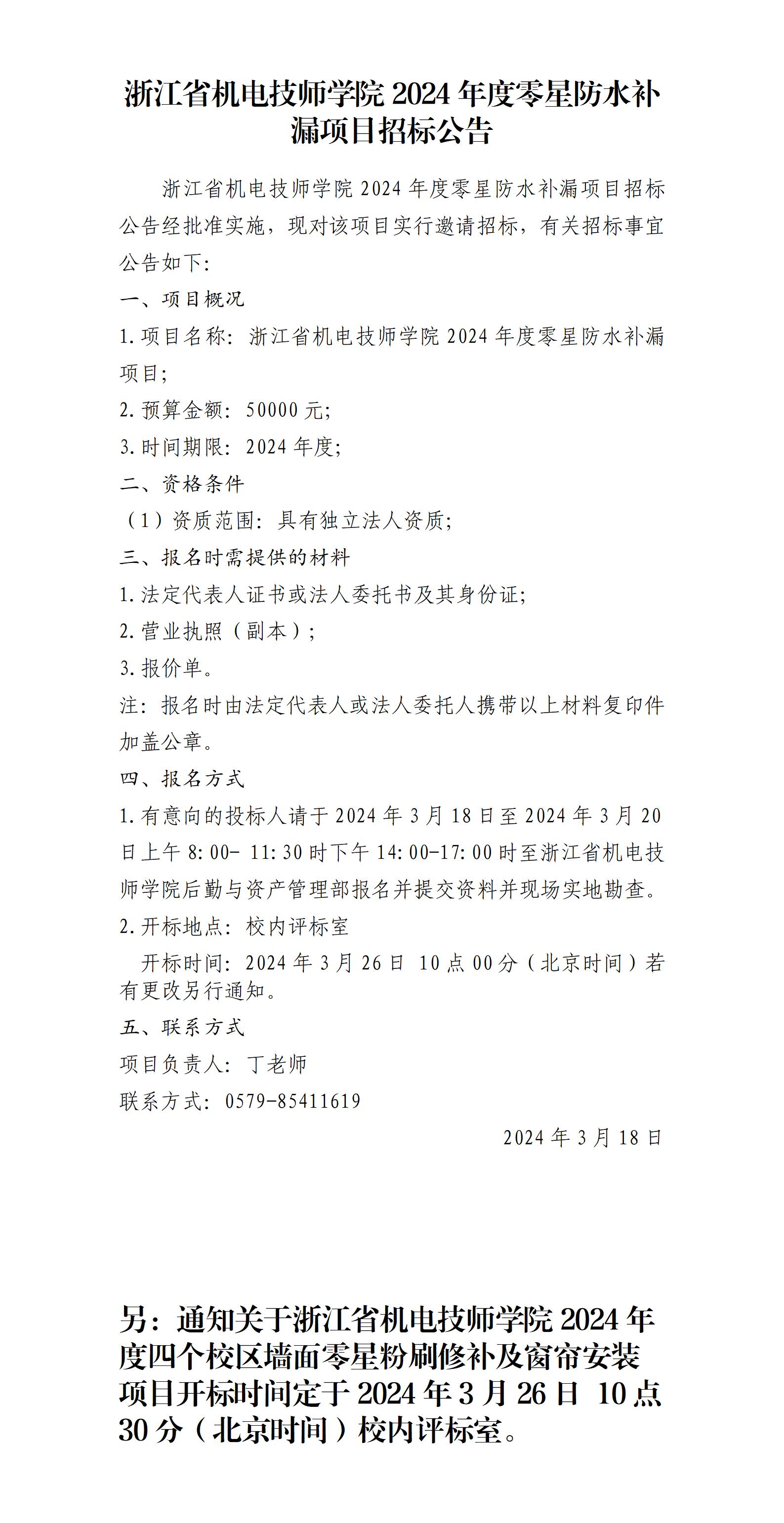 浙江省機電技師學院2024年(nián)度零星防水(shuǐ)補漏項目招标公告