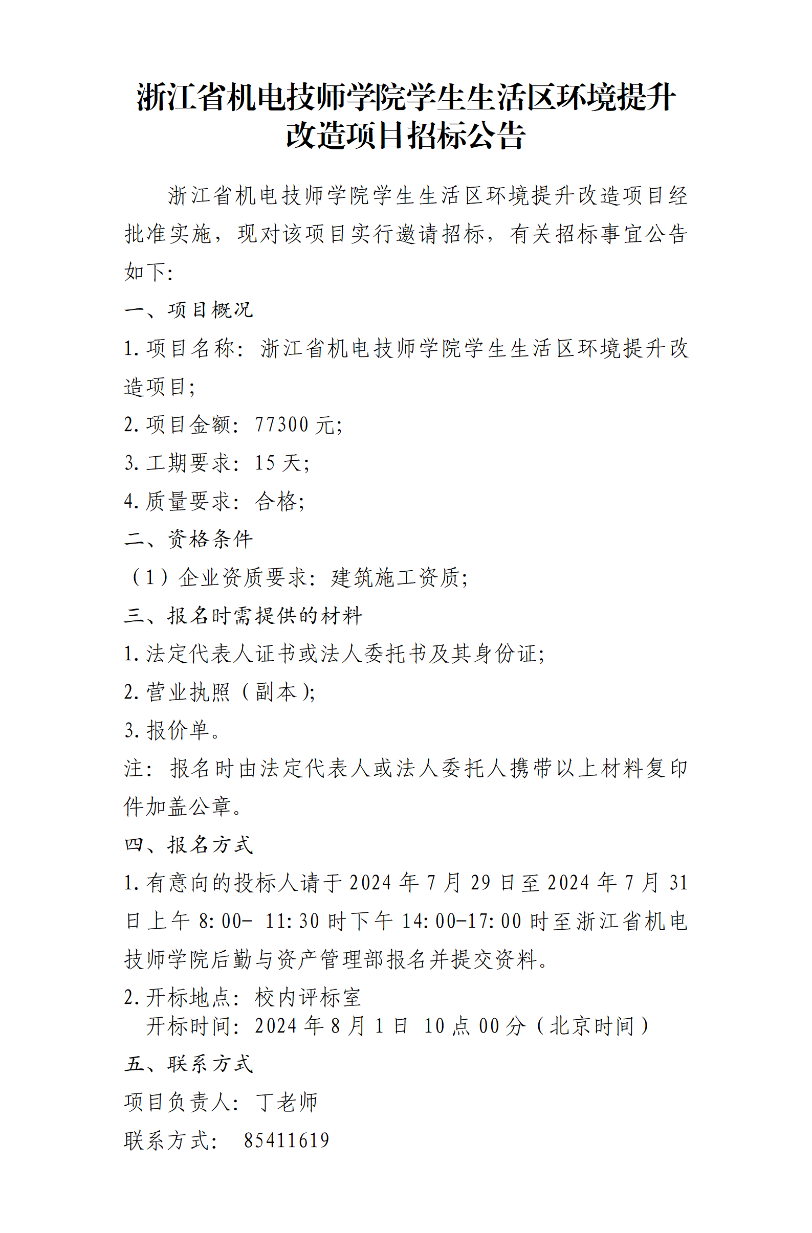 浙江省機電技師學院學生(shēng)生(shēng)活區(qū)環境提升改造項目招标公告