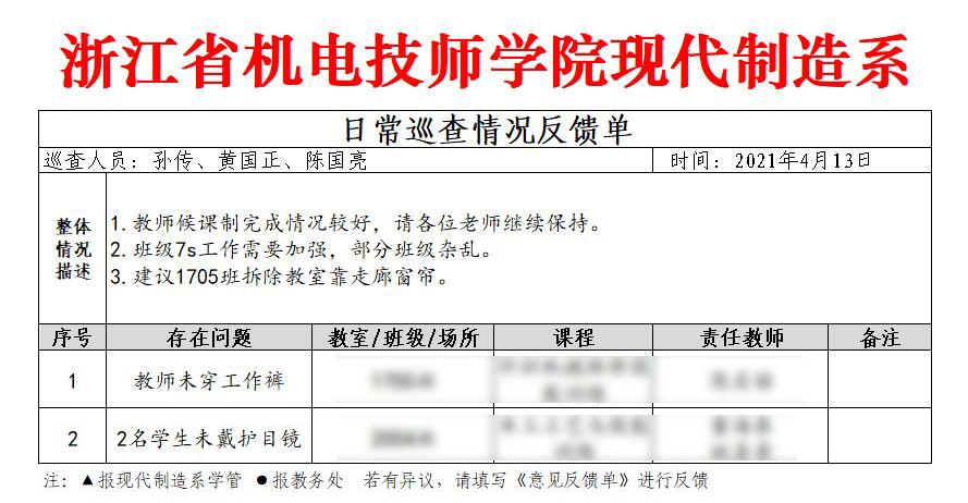 按照(zhào)《2020學年(nián)第二學期現(xiàn)代制(zhì)造系督導工↔(gōng)作(zuò)計(jì)劃》要(yào)求,我系開(kāi)展系列專項督查工(gōng)作(zuò)。