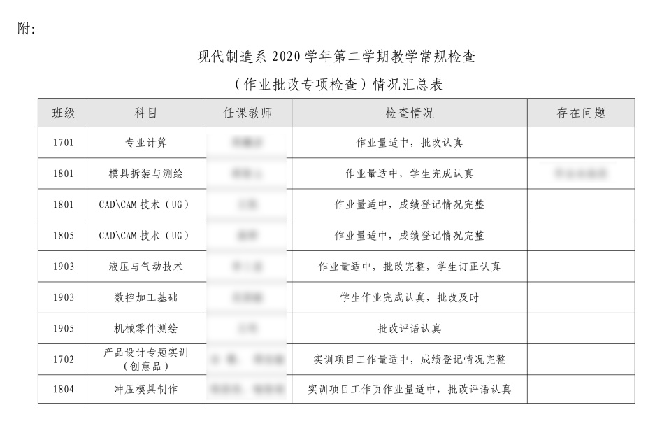 現(xiàn)代制(zhì)造系督導組根據《現(xiàn)代制(zhì)造系教師(shī)教學工(gōng)作(zuò )相(xiàng)關規定》中關于作(zuò)業(yè)批改要(yào)求,開(kāi)展了(le)作£(zuò)業(yè)批閱專項督導,以規範教育日(rì)常,提升教學質量,檢查結果為(wèi)總體(tǐ)作(z'uò)業(yè)批改整體(tǐ)情況較好(hǎo),作(zuò)業(yè)量布置适中并批改認真。