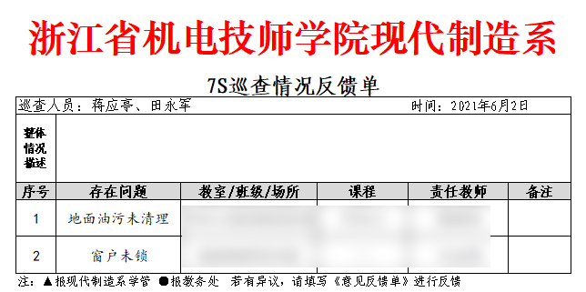 現(xiàn)代制(zhì)造系持續開(kāi)展實訓區(qū)域檢查、7S檢查。♦檢查結果為(wèi)實訓區(qū)域衛生(shēng)整潔,設施擺放(fàng)整齊,通(tōng)報(bào)人(rén)次大(dà✔)幅下(xià)降。